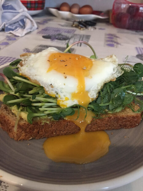 Avocado Toast With Sunflower And Pea Microgreens, Topped With A Sunny Side Egg And Cracked Black Pepper.Avocado Toast With Sunflower And Pea Microgreens, Topped With A Sunny Side Egg And Cracked Black Pepper.